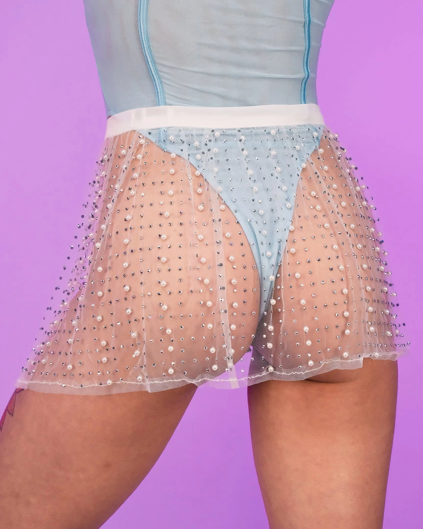 - Unlined Sheer Rhinestone and Pearl Beaded Tie Skirt