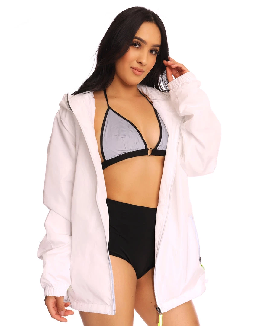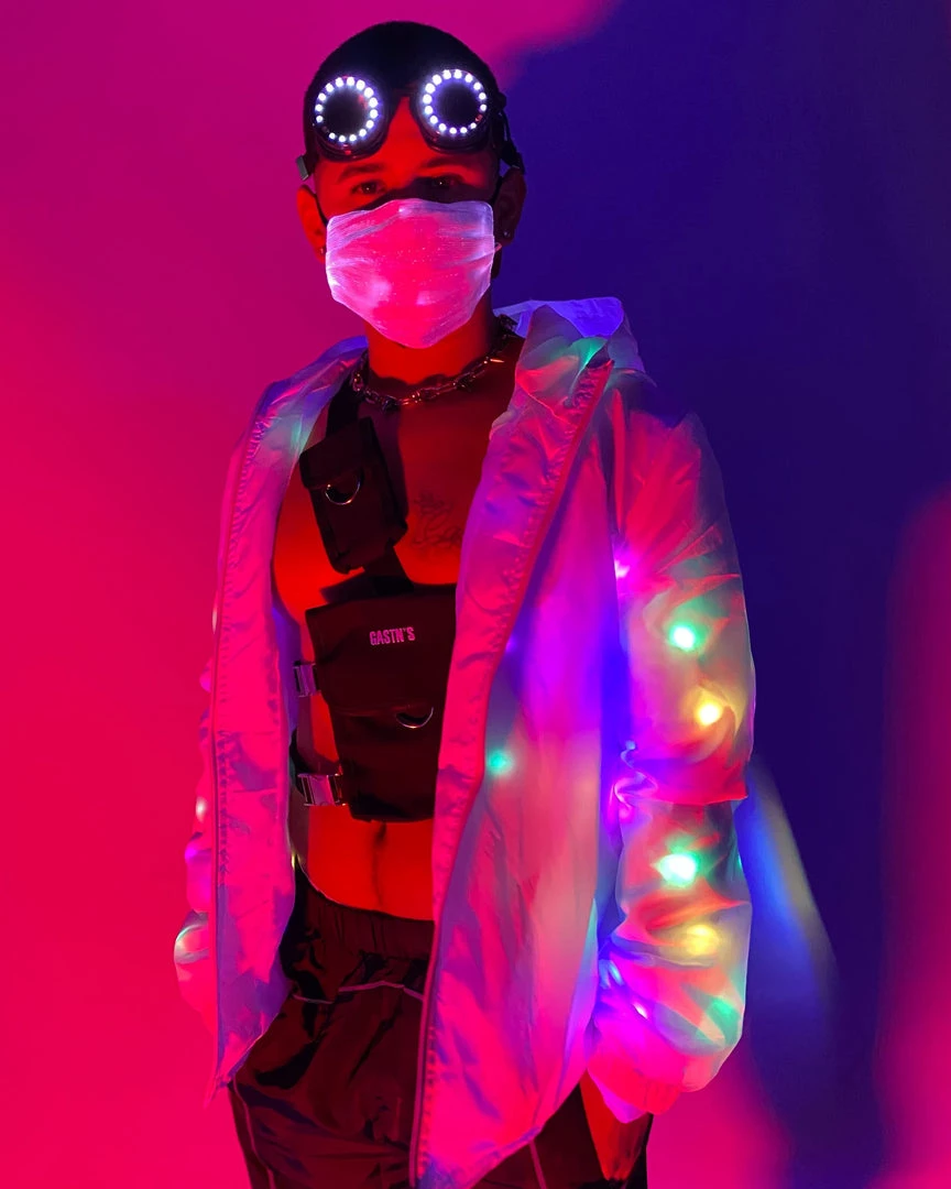 GET FLASHY in this light up windbreaker! Features reflective lining details, multi-colored lights and FOUR different light modes. Uses 3 AA batteries (not included).
