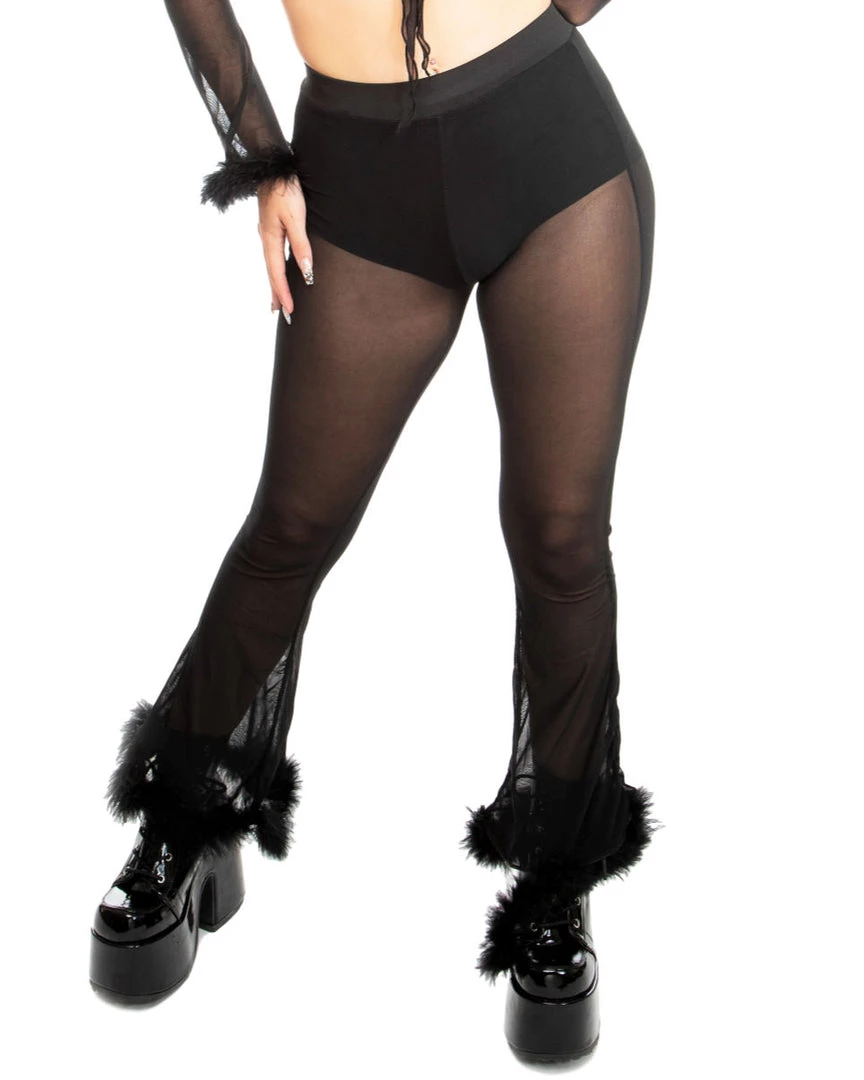 95% Polyester 5% Spandex Sheer Pants with elastic top band for secure and comfortable fit. Available in black and pink. Faux fur.