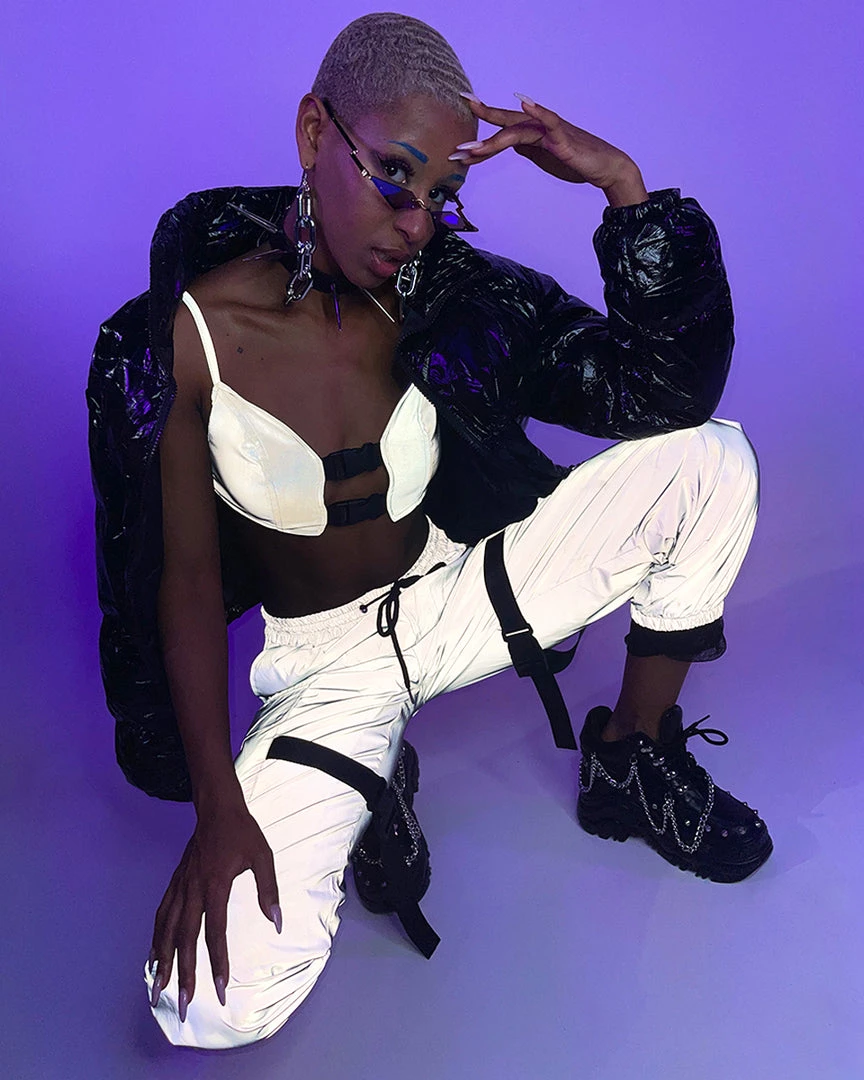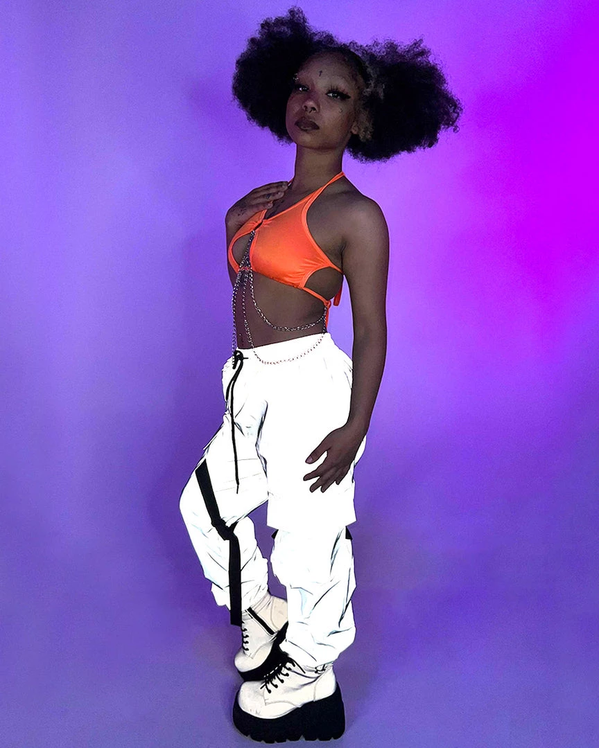 This shit is FLASH REFLECTIVE! Take a pic with yr flash on to show off that flash! Features drawstring waist for an adjustable fit.