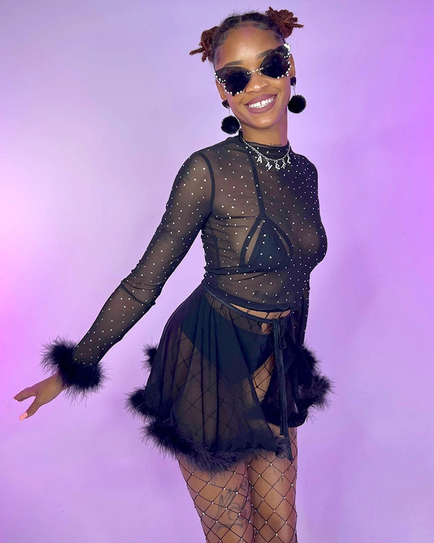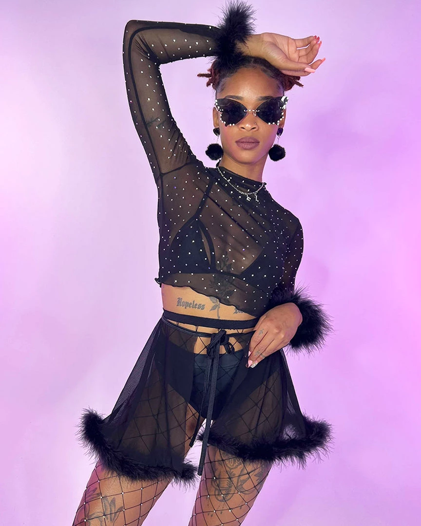 Pair with pasties or yr fave bra to complete the look! Features marabou feathers.