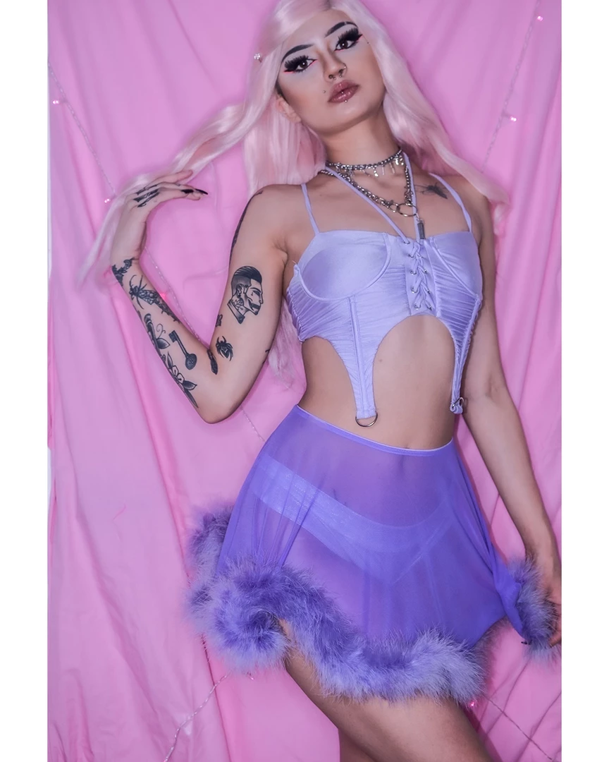 Sheer Plush Trim Tie Around Half Skirt. Faux fur.