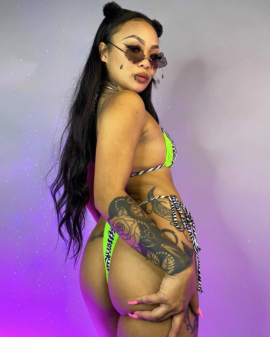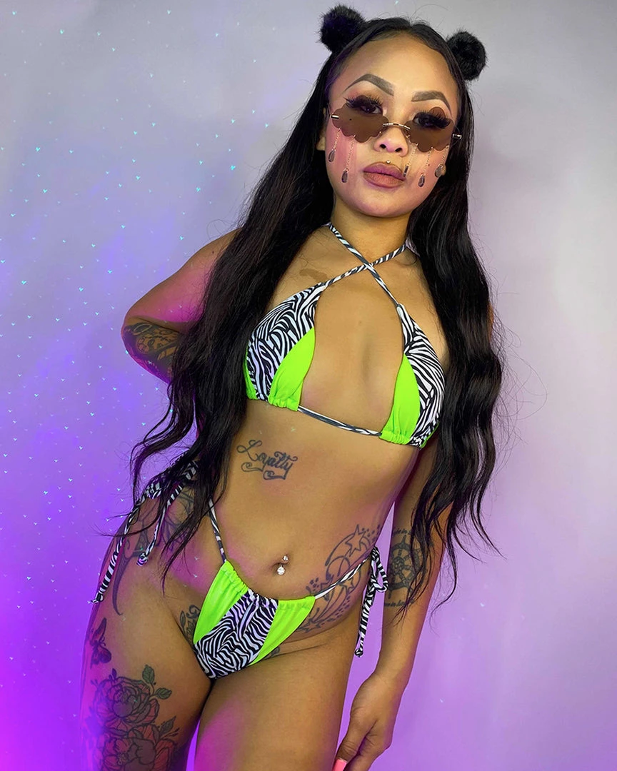 Get yr swim on in this vibrant neon green, zebra print set! Top and bottom have ties for an easily adjustable fit!