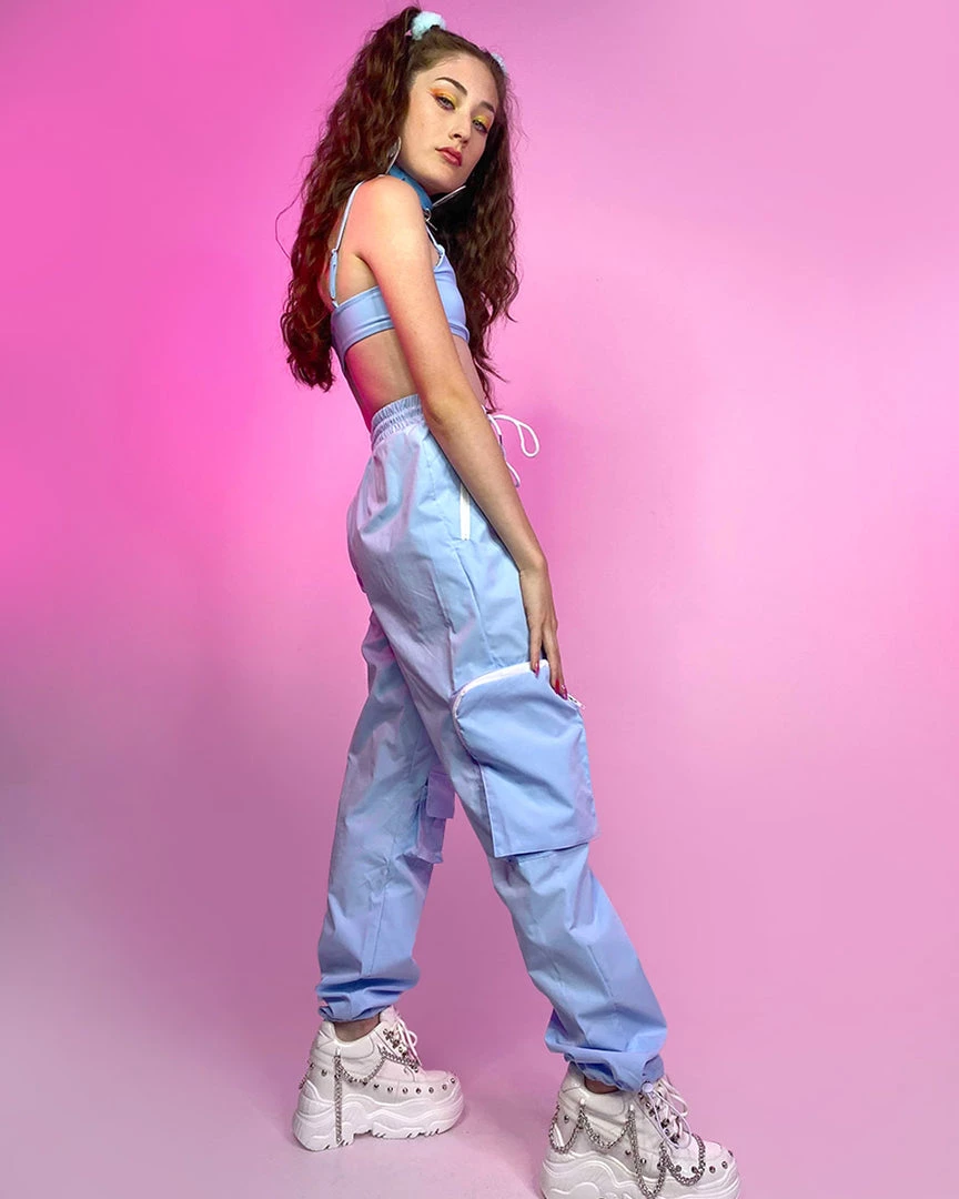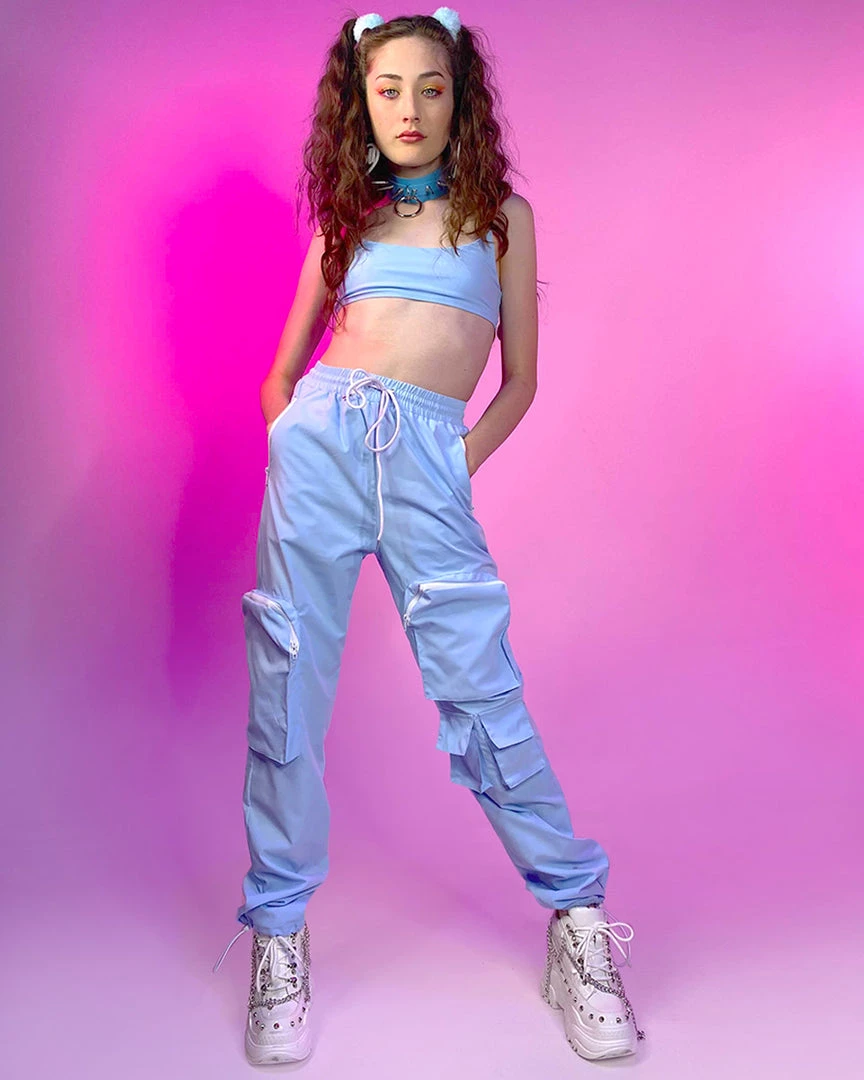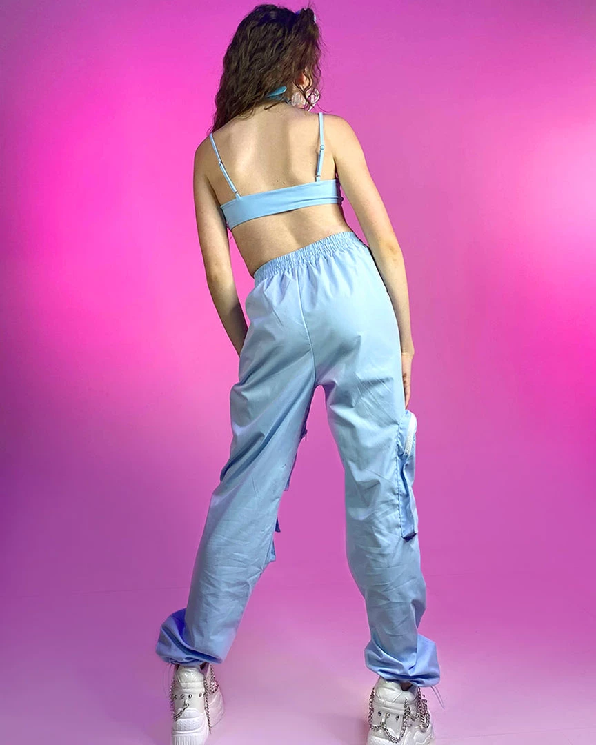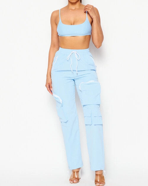 - Two Piece Set, Featuring Cropped Top with Adjustable Spaghetti Straps, Contrast Drawstring Pants with Utility Zipper Pockets.