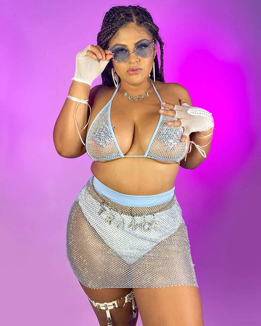 This set includes jewel fishnet top & skirt! Pair with your favorite pasties to complete the look! SET DOES NOT COME WITH UNDERWEAR.
