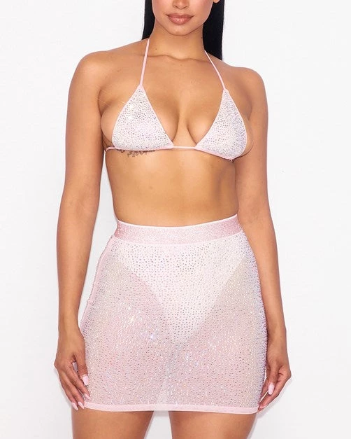 This set includes rhinestone triangle top and mesh skirt! SET DOES NOT COME WITH UNDERWEAR.