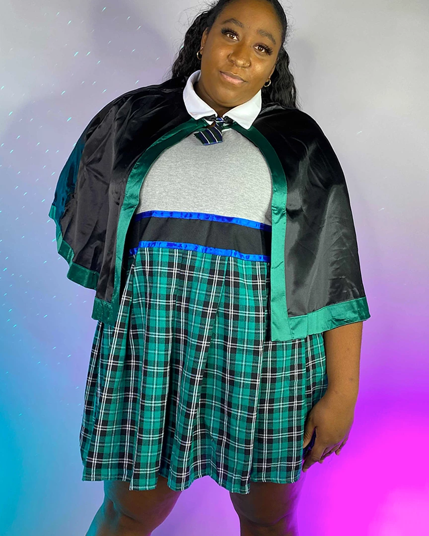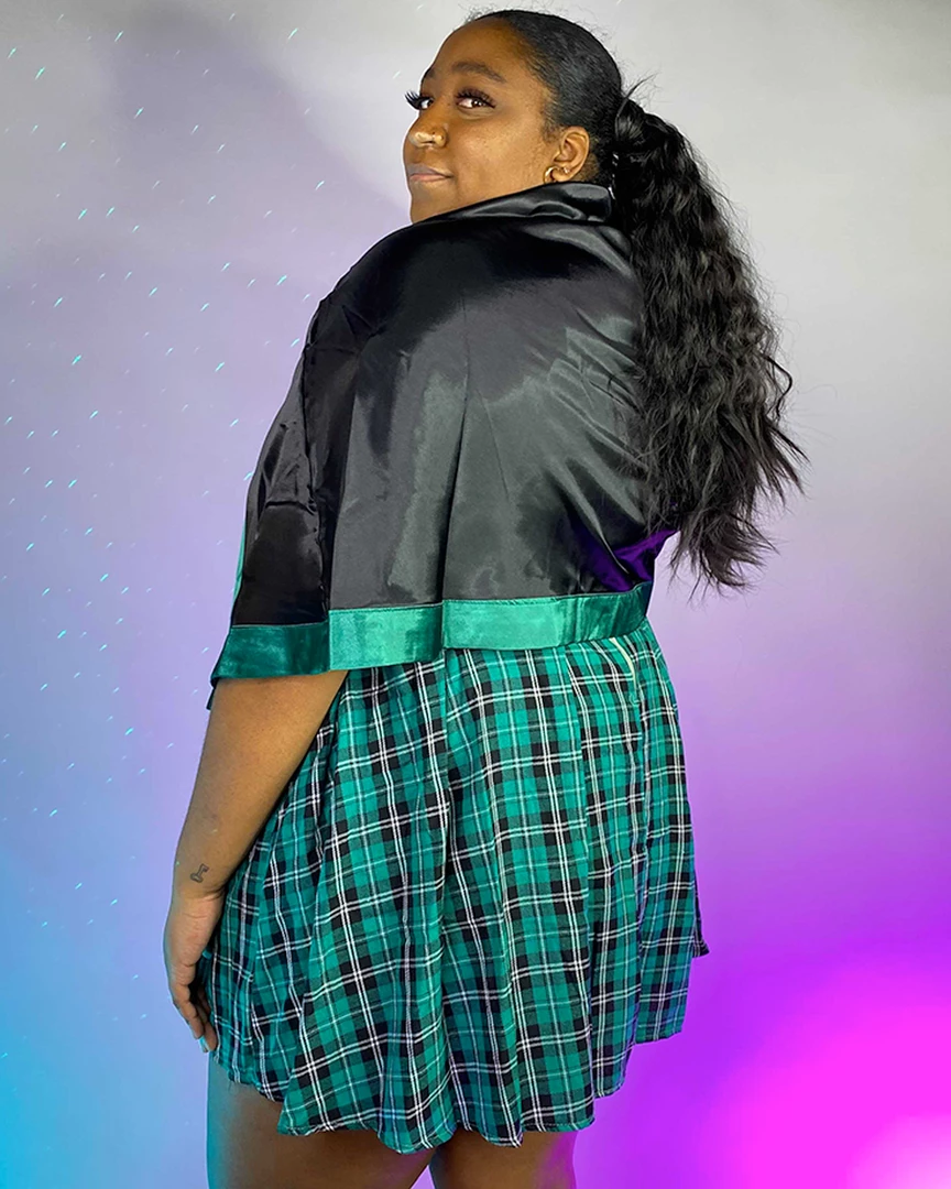 Includes crop top with badge accent, high waist plaid skirt, and cape with attached tie. Magic wand not included.