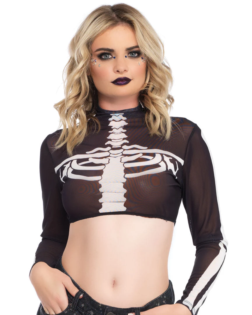Leg Avenue Skeletons And Bones Neck Mesh Long Sleeve Rave Crop Top