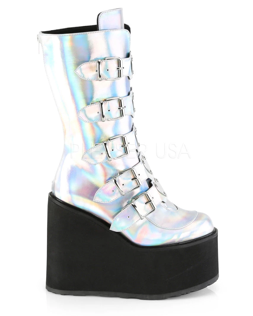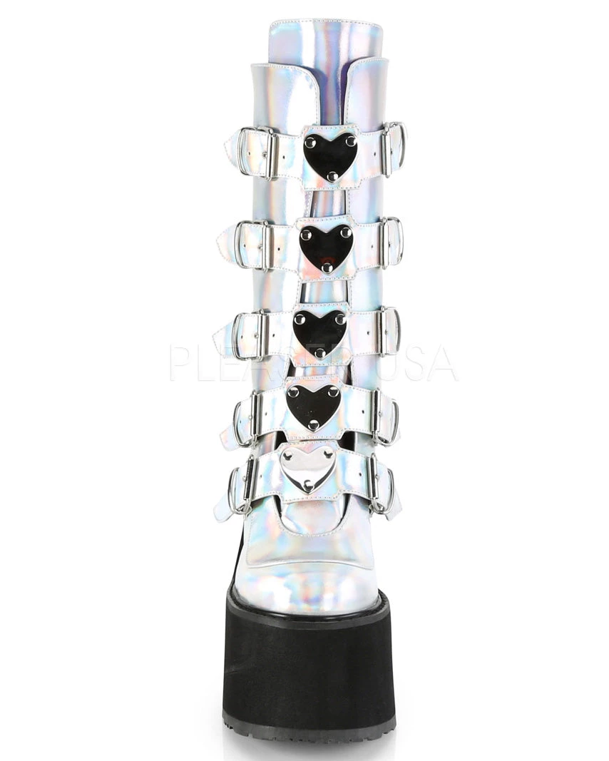 Pleasers Acid Jungle Demonia Silver Hologram Platform Mid-Calf Boots