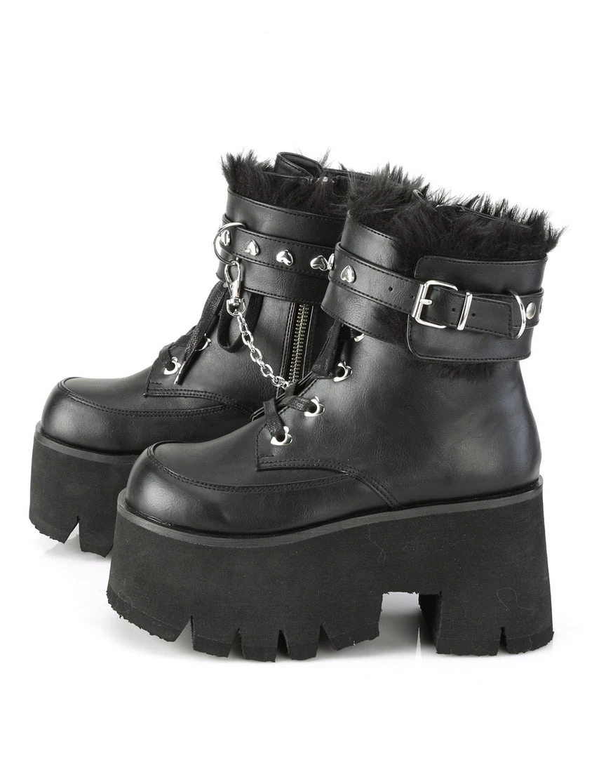 3 1/2″ (90mm) Chunky Heel, 2 1/4″ (57mm) Cut-Out Platform Heart Eyelet Lace-Up Ankle Boot Featuring Fur Lined Adjustable Removeable Ankle Cuffs W/ Heart Studs, D-Ring & Chain w/ Swivel Snap Hooks Details, Metal Side Zip Closure