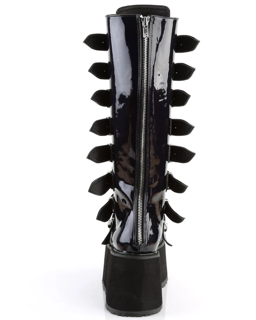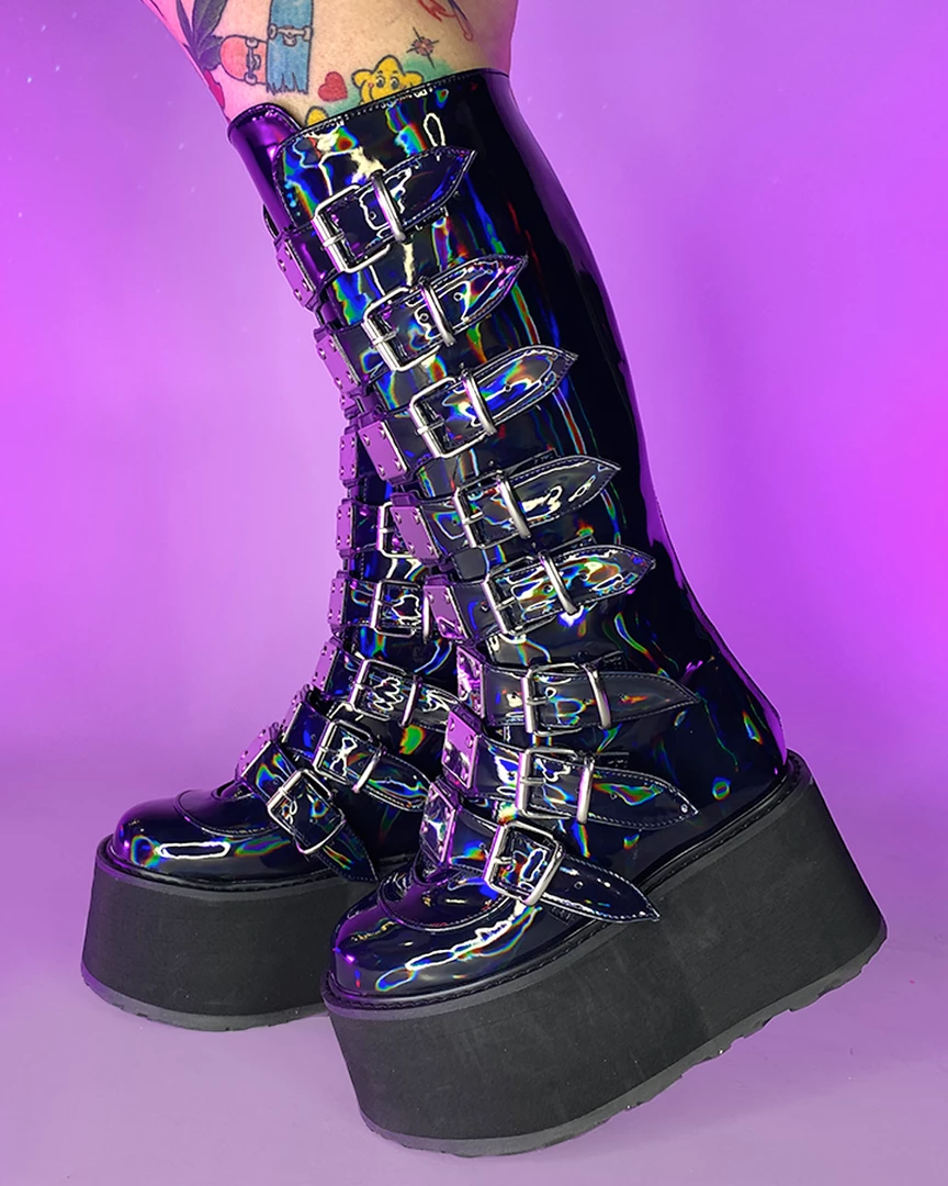 Time to show your feet some love and dance the night away in these amazing vegan platform boots with chrome plated straps. Comes with full back zip closure for easy on off wear!