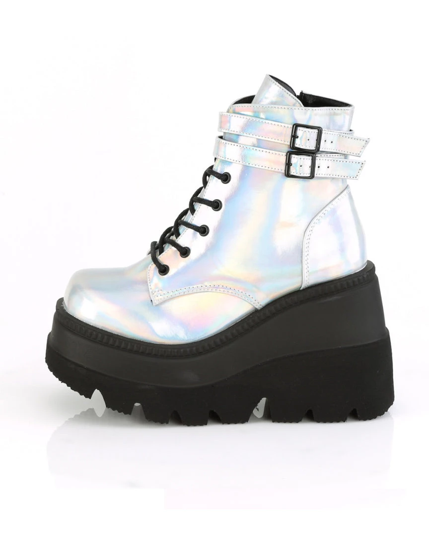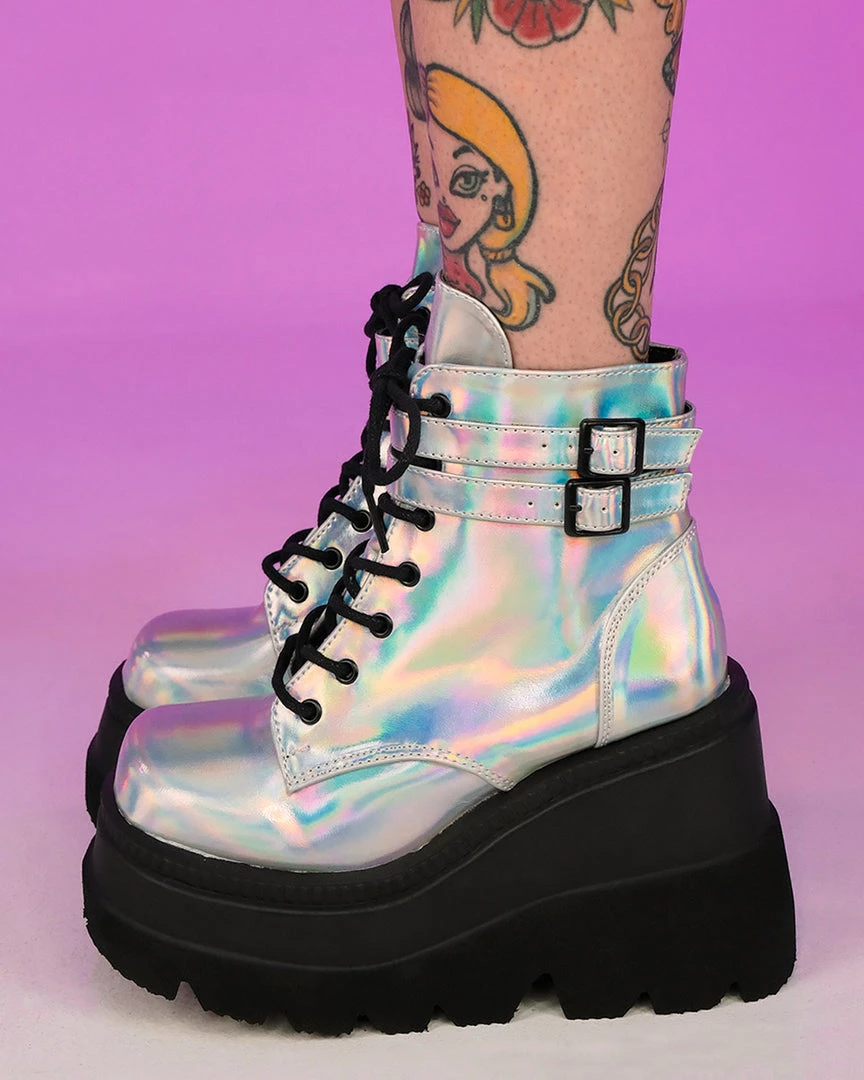4 1/2″ (114mm) Tiered Platform Lace-Up Front Ankle Boot Featuring Double Grommet Buckle Straps, Inside Zip Closure