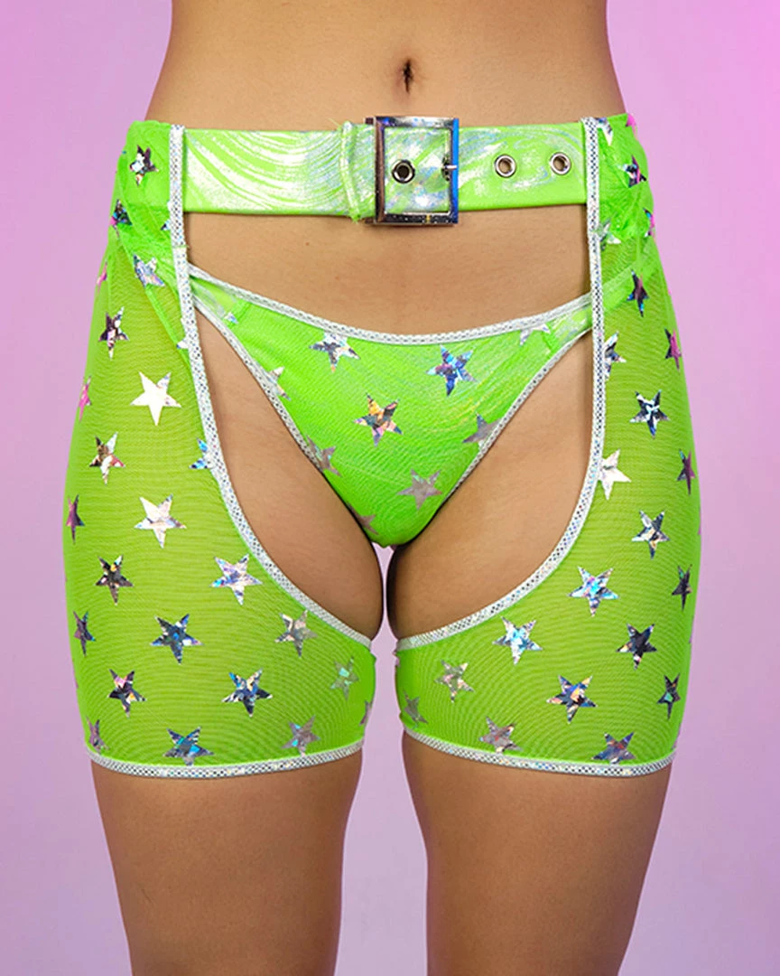 Neon Green/Silver Cosmic Stardust Mesh with Stars Print Chaps with Belt