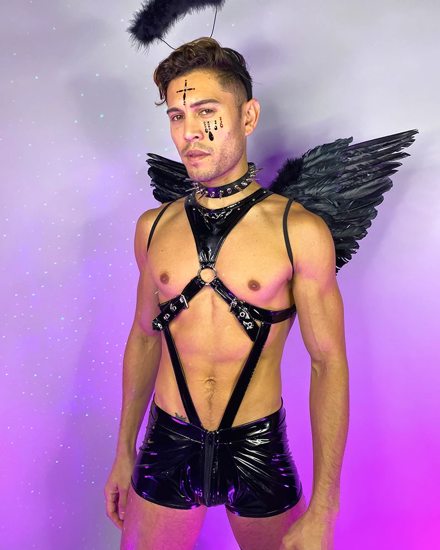 Includes Black Vinyl Singlet with Buckled Detail. Does not include angel wings.