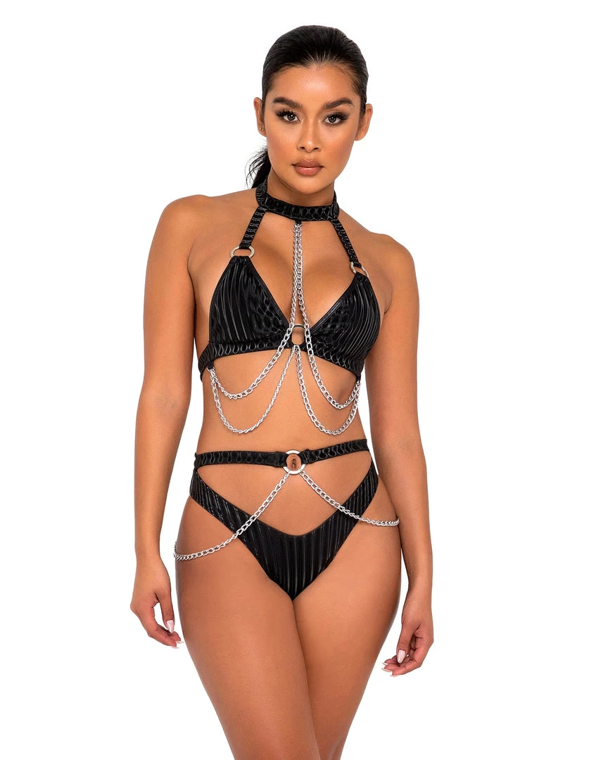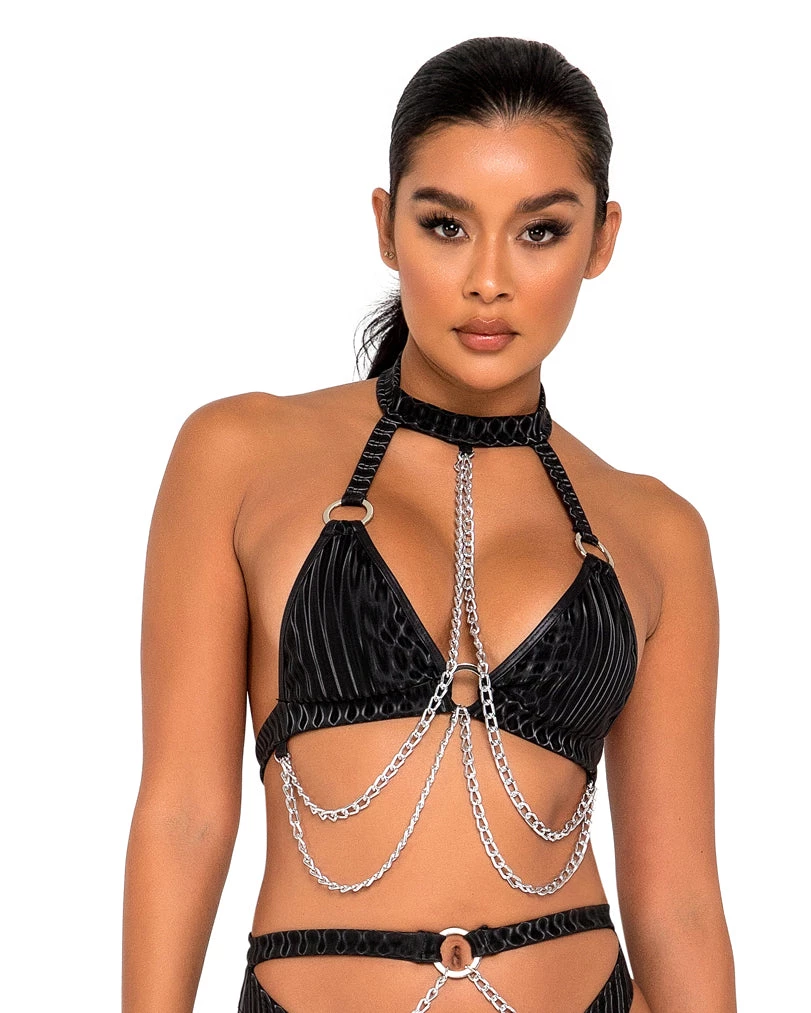 High Fidelity Shine Striped Bikini Top with Ring & Chain Detail