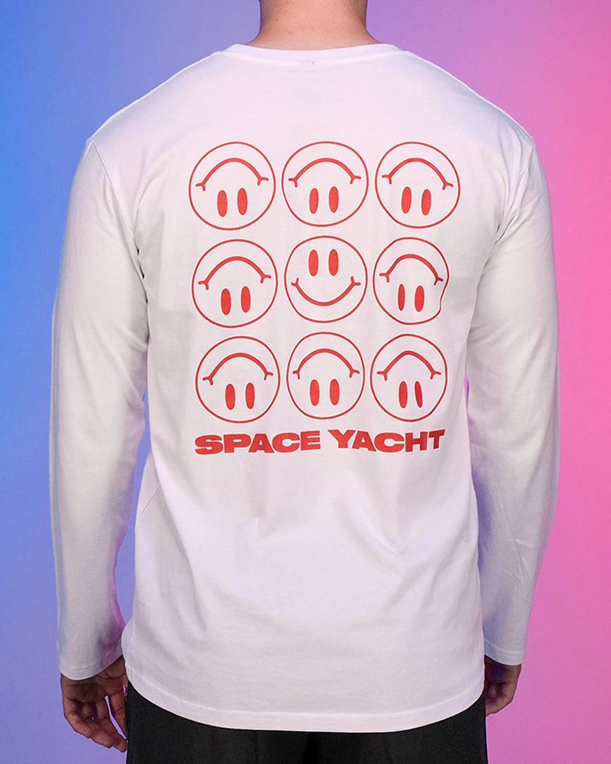 This shirt features the Space Yacht WE ARE SO F????CKED logo on the front and our classic smiley design on the back along with printed on neck tags and a sewn on rocket label at the bottom.