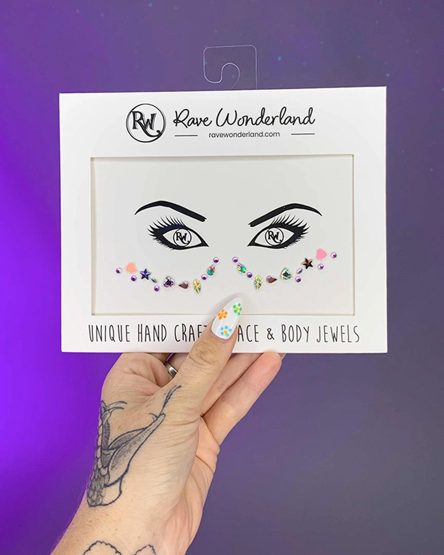 Pre-arranged face jewels with adhesive. Super easy application! Just peel and stick onto desired area. Durable and holds all night while you dance the night away! Apply onto dry skin without makeup.