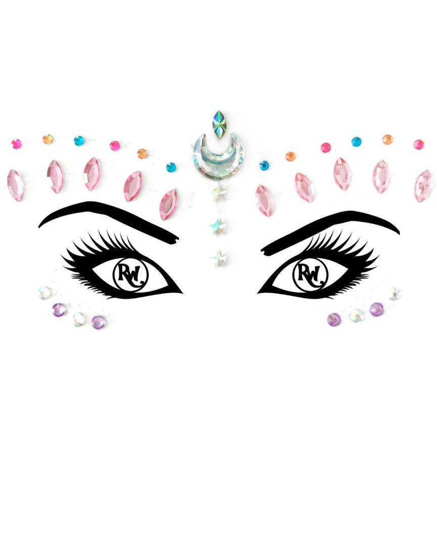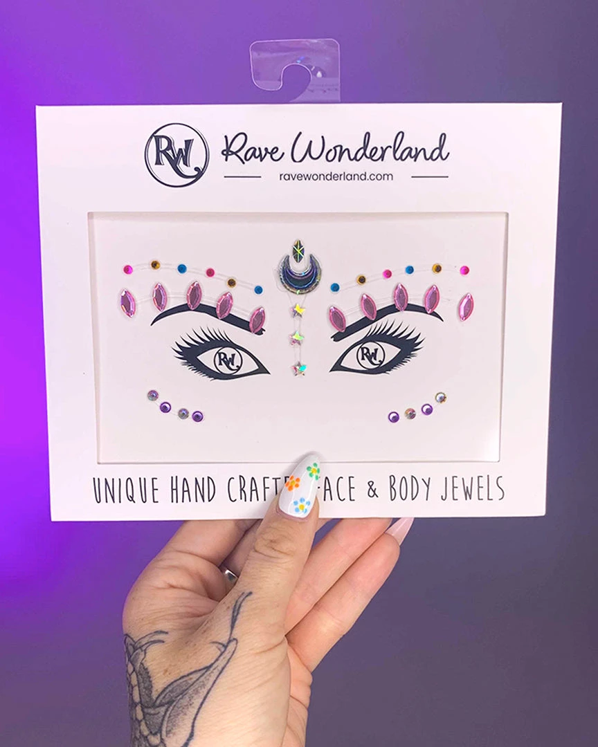 Prearranged rhinestone face jewels with adhesive. Super easy application! Just peel and stick onto desired area. Durable and holds all night while you dance the night away! Apply onto dry skin without makeup.