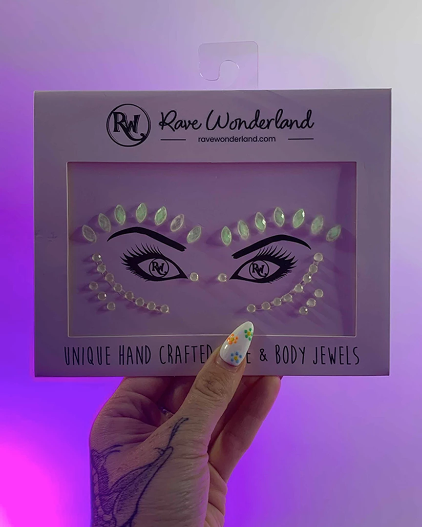THESE JEWELS GLOW IN THE DARK and are BLACKLIGHT REACTIVE! Prearranged adhesive face jewels. Just peel and stick. Long lasting adhesive for a secure discreet hold all night long.
